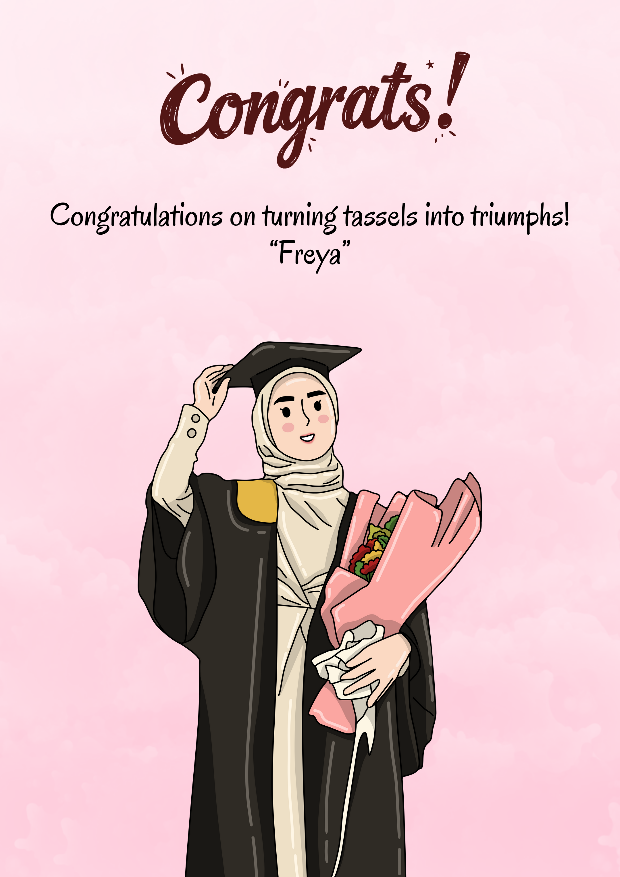 This uplifting design presents a graduate proudly holding a bouquet symbolising both achievement and appreciation.