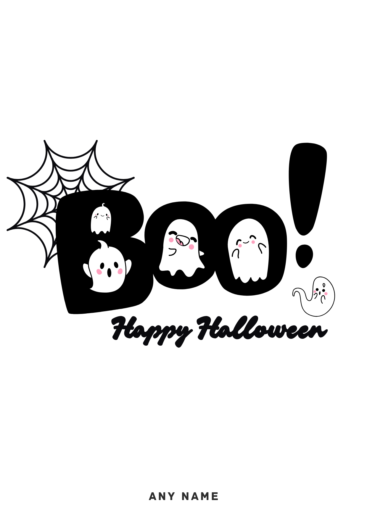 A clean monochrome Halloween card featuring a bold Boo design with playful spider web details.
