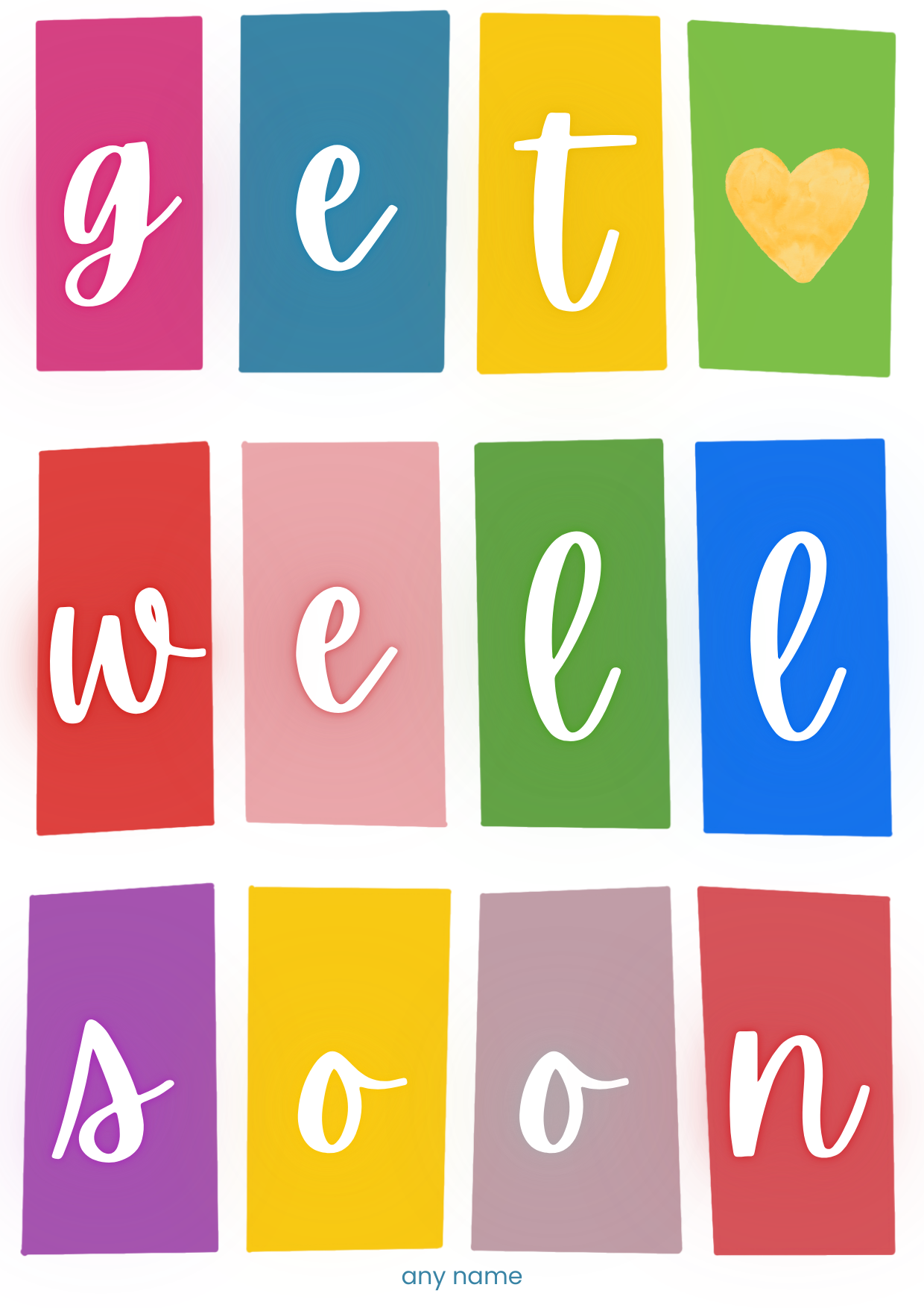 A vibrant uplifting card with bold color blocks spelling out get well soon.