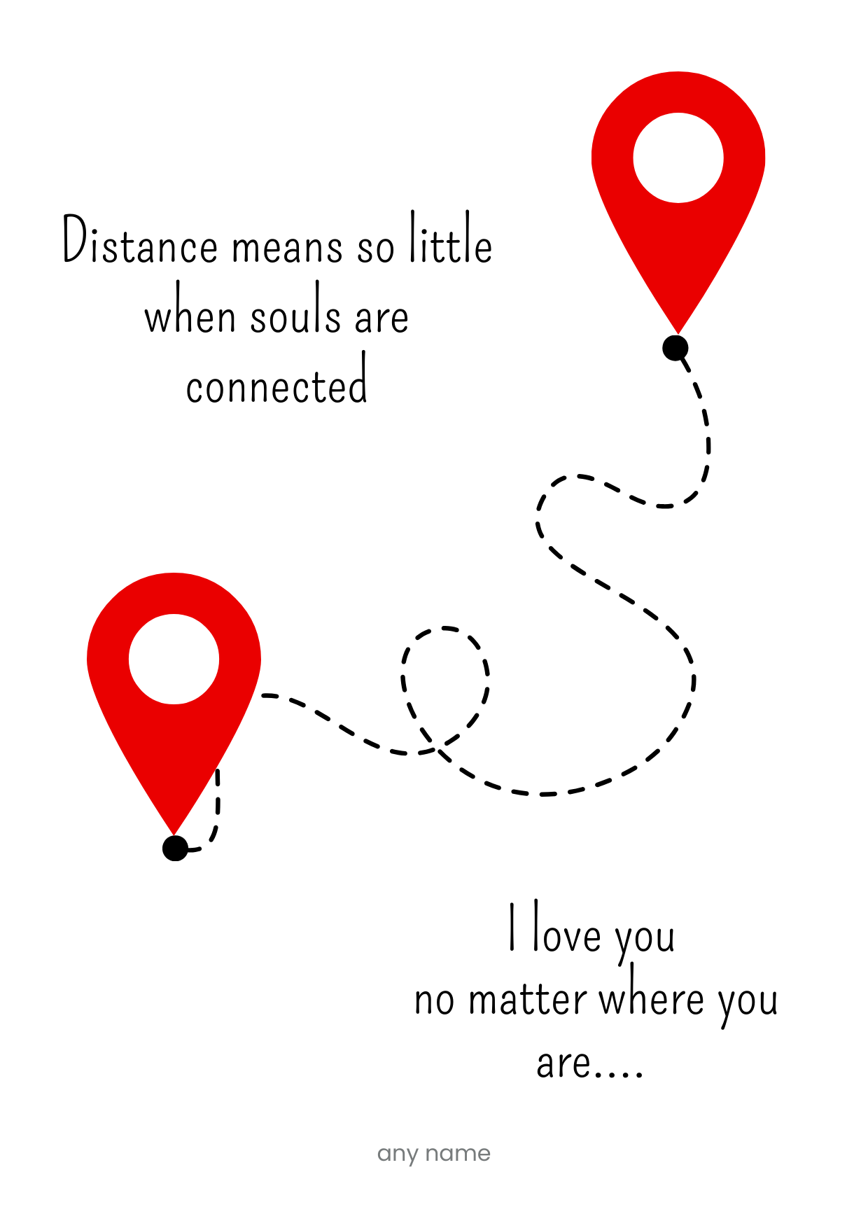 This heartfelt card highlights the idea that distance becomes small when two souls share a deep connection. With two location markers joined by a dotted trail the artwork beautifully captures long distance love friendship or family bonds. It is a meaningful way to tell someone you love them no matter where they are.