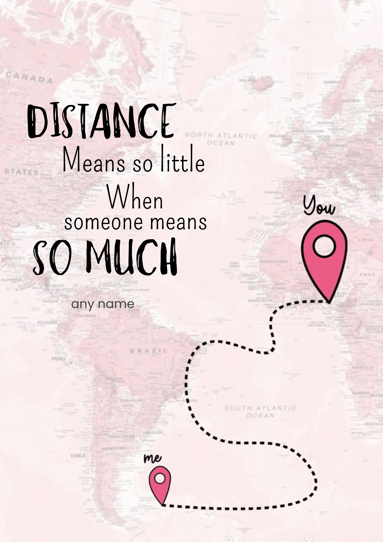 This meaningful card features a world map style background with location pins connected by a dotted path. The message highlights that distance feels small when someone means so much. Designed to comfort and uplift loved ones who are far away, it expresses affection, longing, and emotional closeness no matter the miles in between.