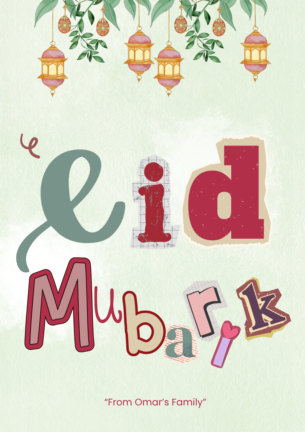 his cheerful Eid Mubarak card captures the spirit of celebration with its hanging lanterns and lively hand-lettered typography.