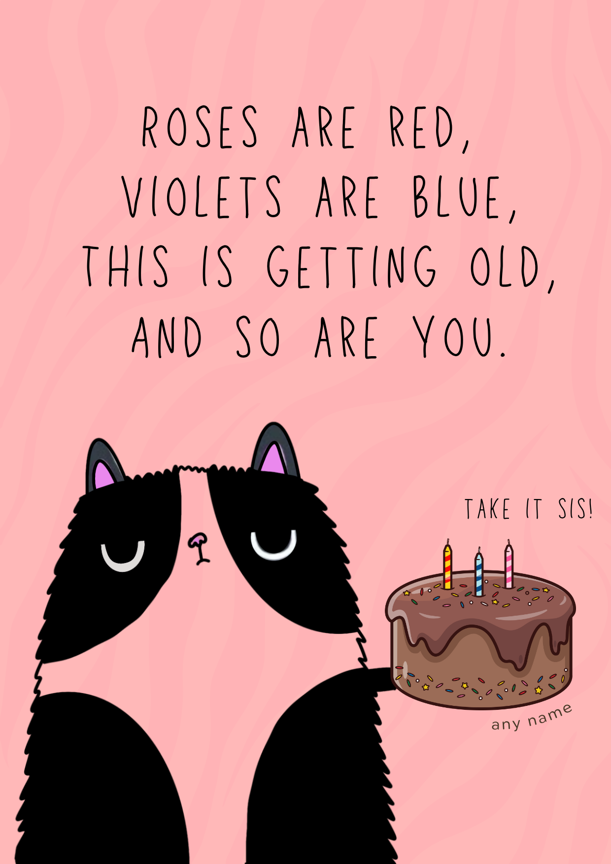 Featuring a mischievous illustrated cat and a slice of birthday cake, it’s the perfect blend of sass and sweetness.