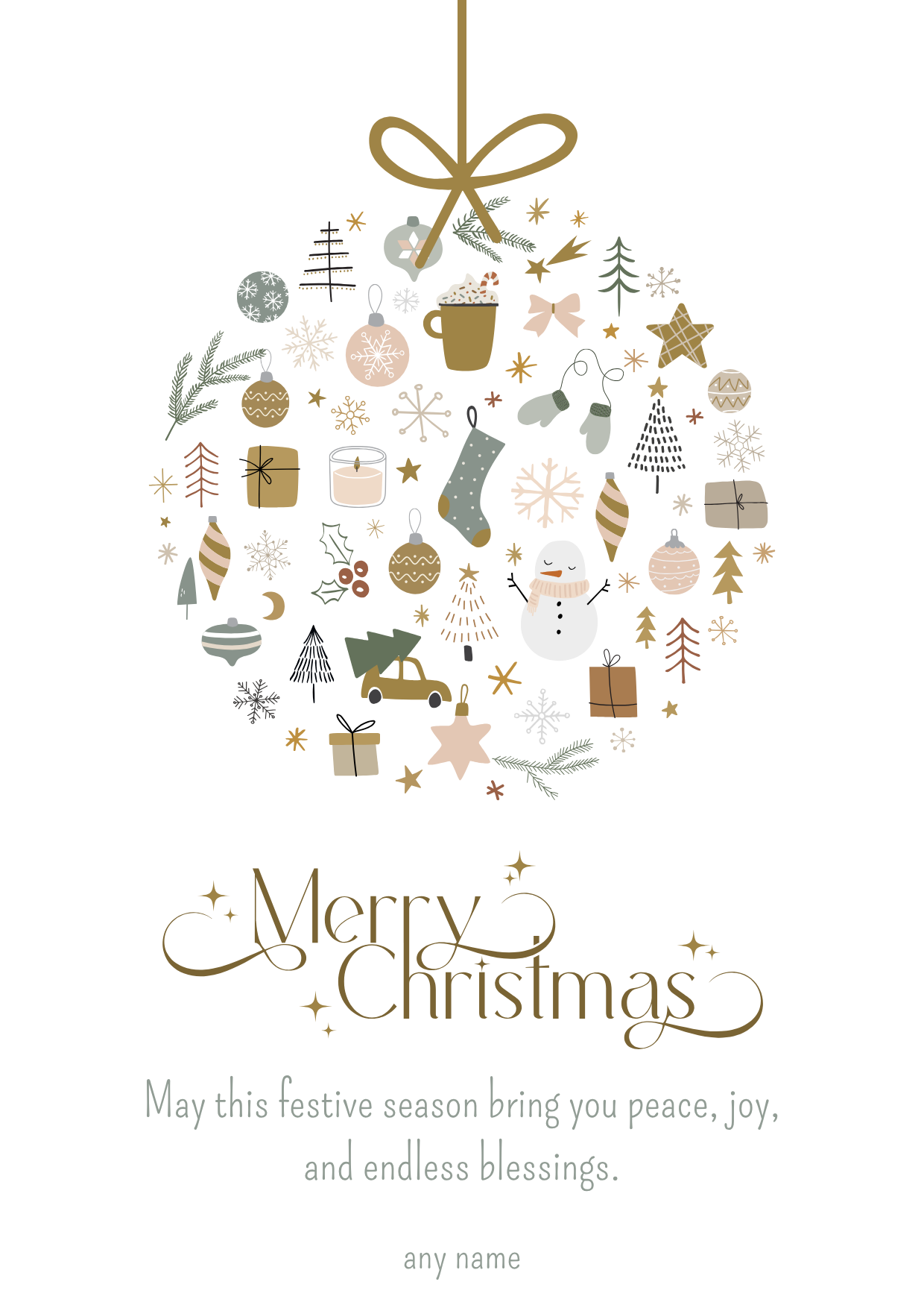 A refined festive card featuring a gold ornament design filled with seasonal icons.