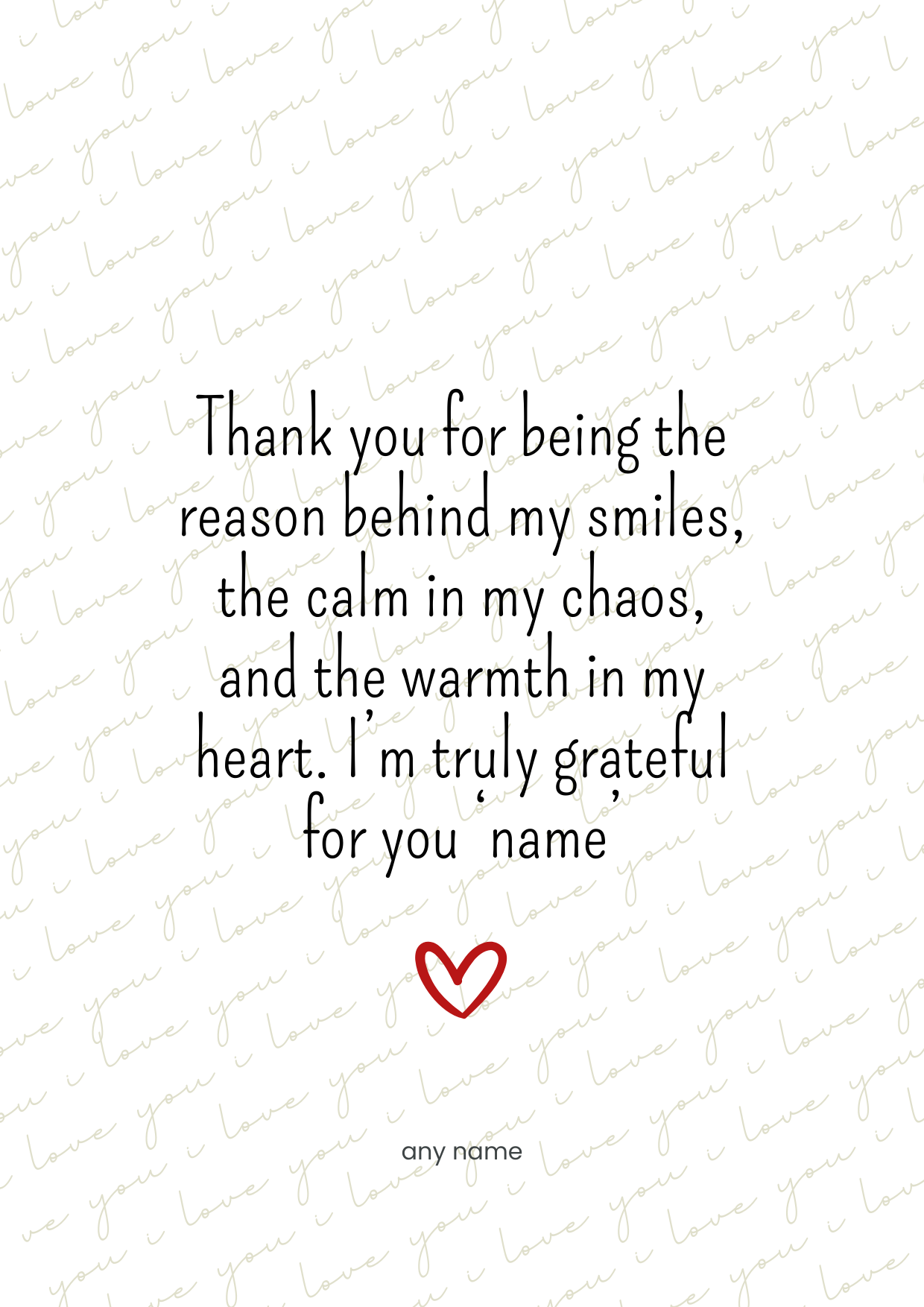 This thoughtful design features a meaningful message about love support and emotional warmth making it perfect for someone who has made a positive difference in your life. The subtle text background and delicate heart illustration create an intimate personal feel ideal for partners family or cherished friends. Printed on premium card stock with a clean elegant finish.