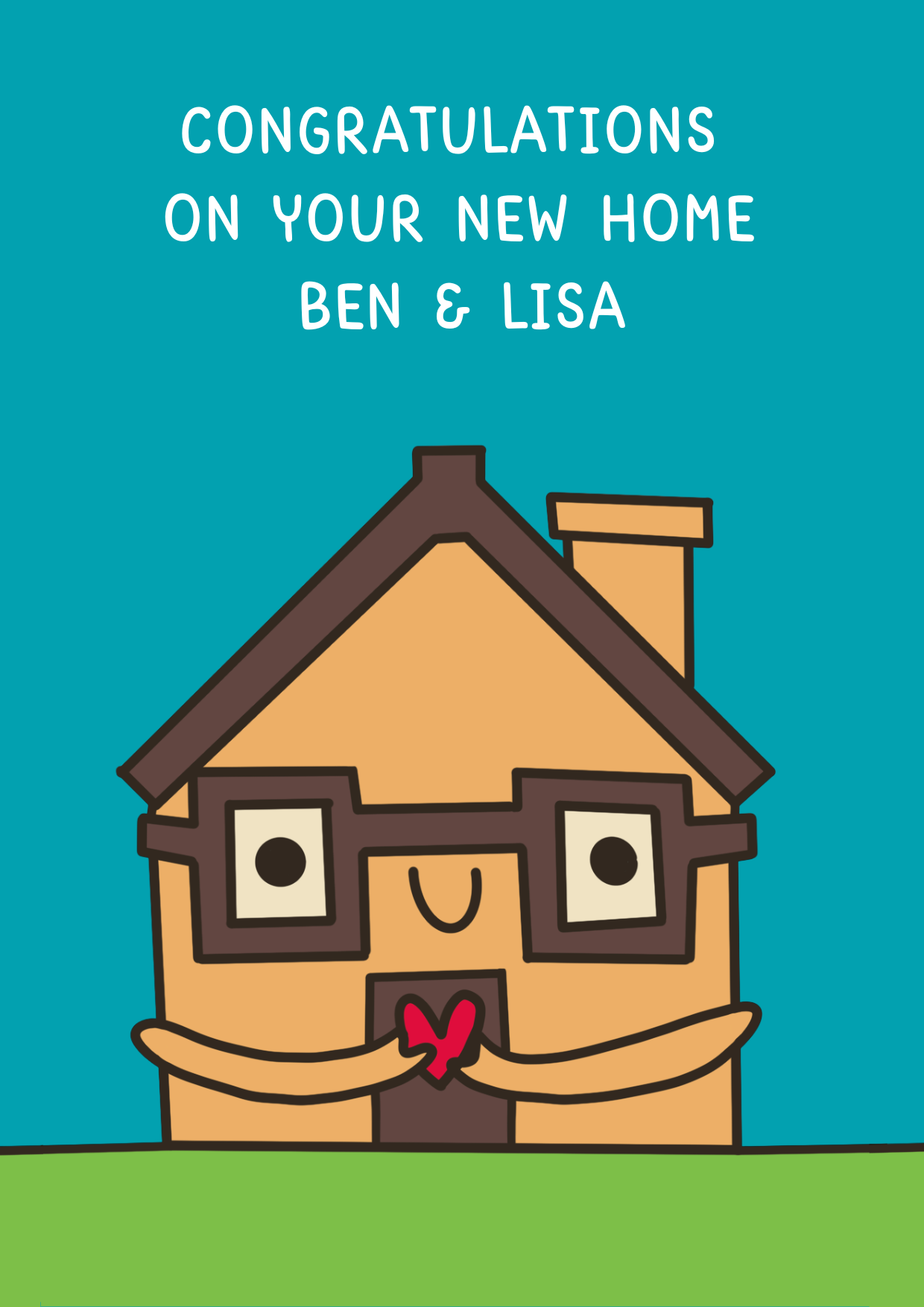 A bright cheerful new home card featuring a cute smiling house illustration on a bold teal background.