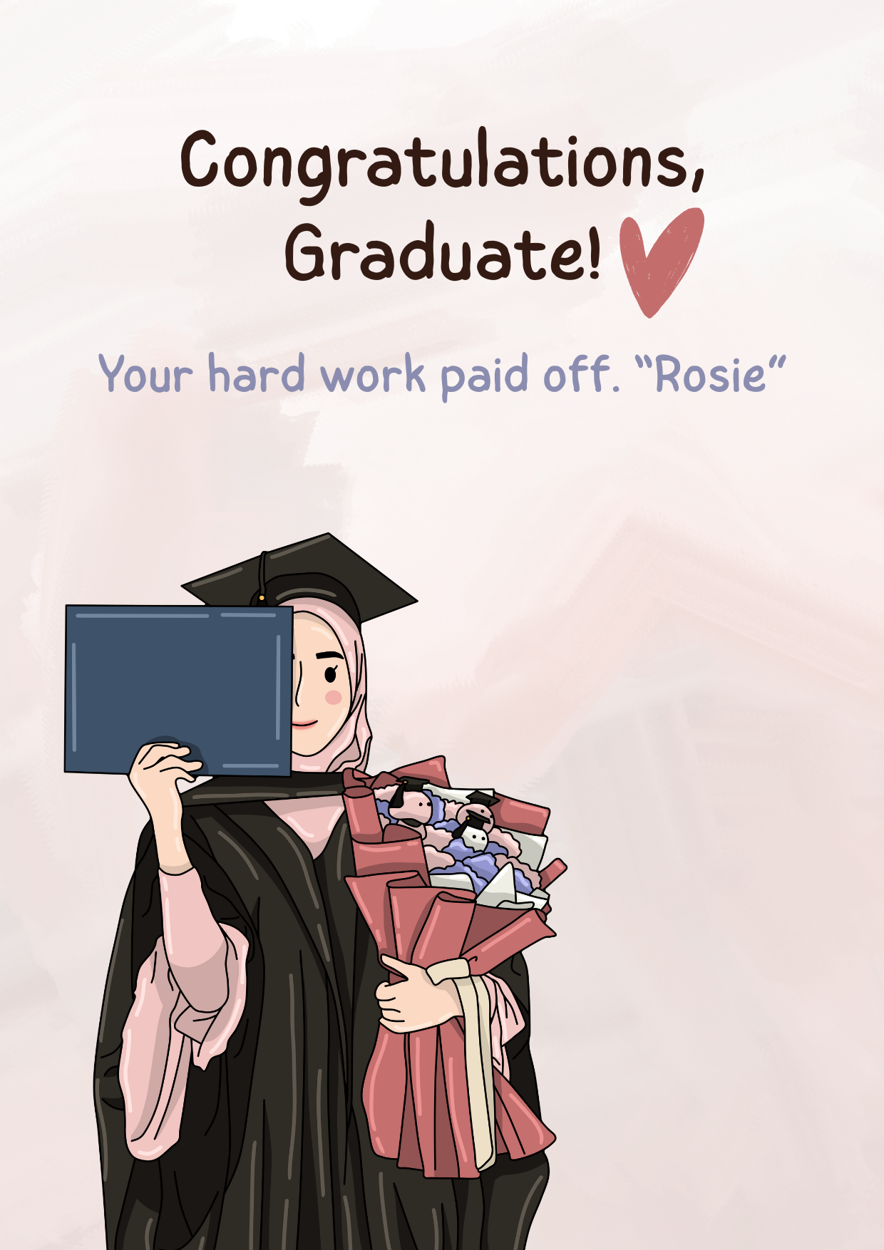 A heartfelt graduation card showing a graduate proudly holding a diploma and a bouquet.