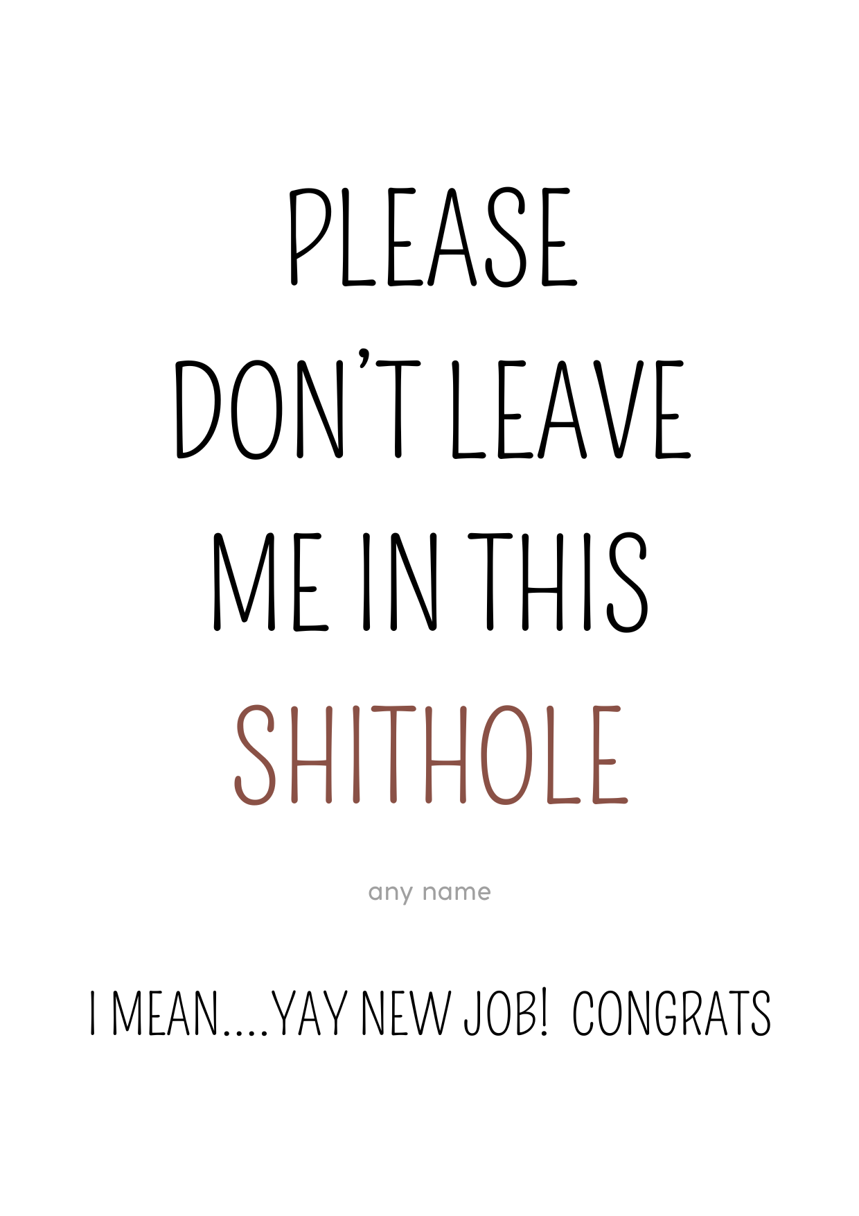 The message please dont leave me in this shithole is delivered with dry wit while the small line beneath lightens the tone with a fun sarcastic twist about celebrating the new job.