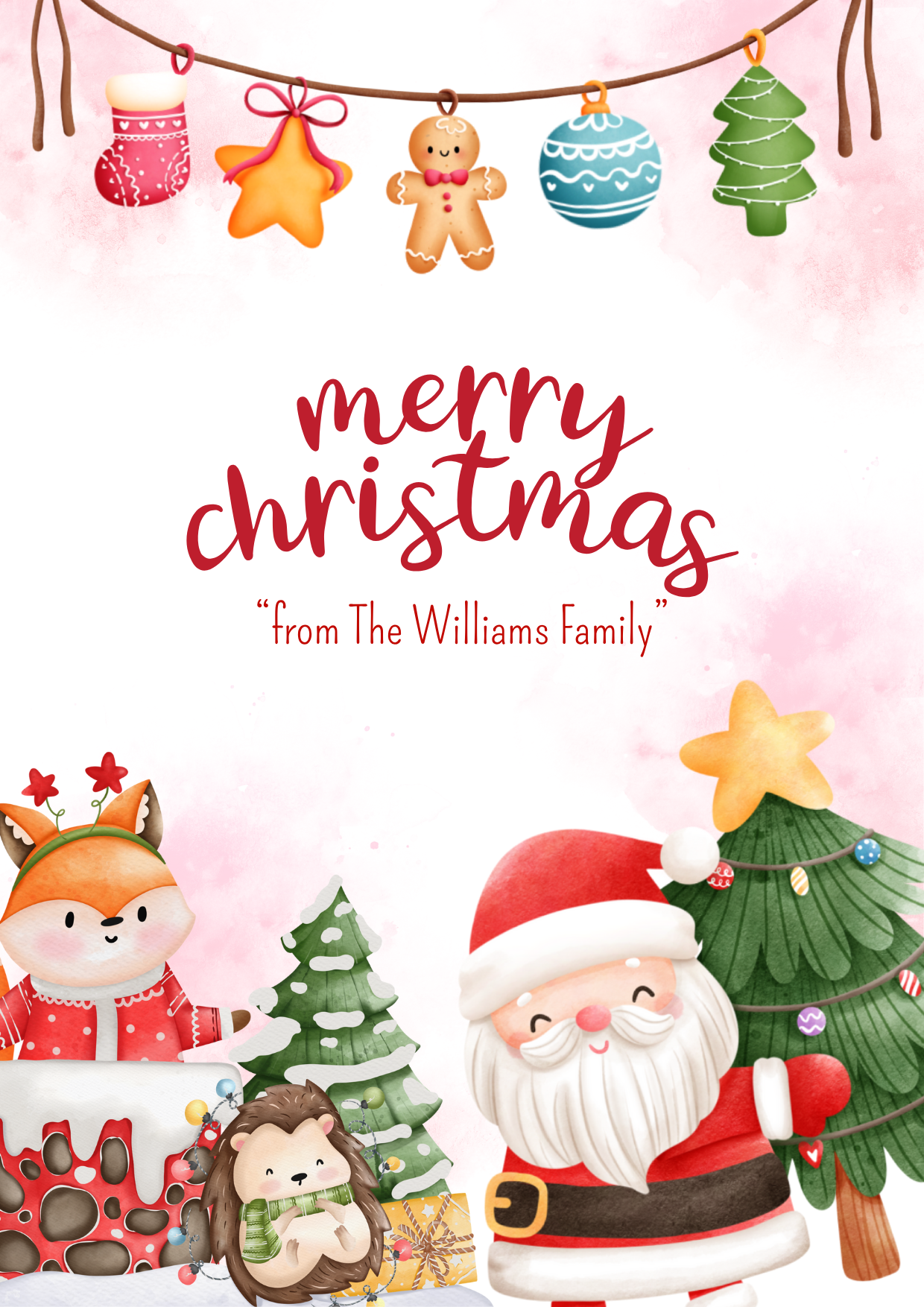 A playful and colourful card featuring Santa, woodland friends and hanging decorations in a painted style.