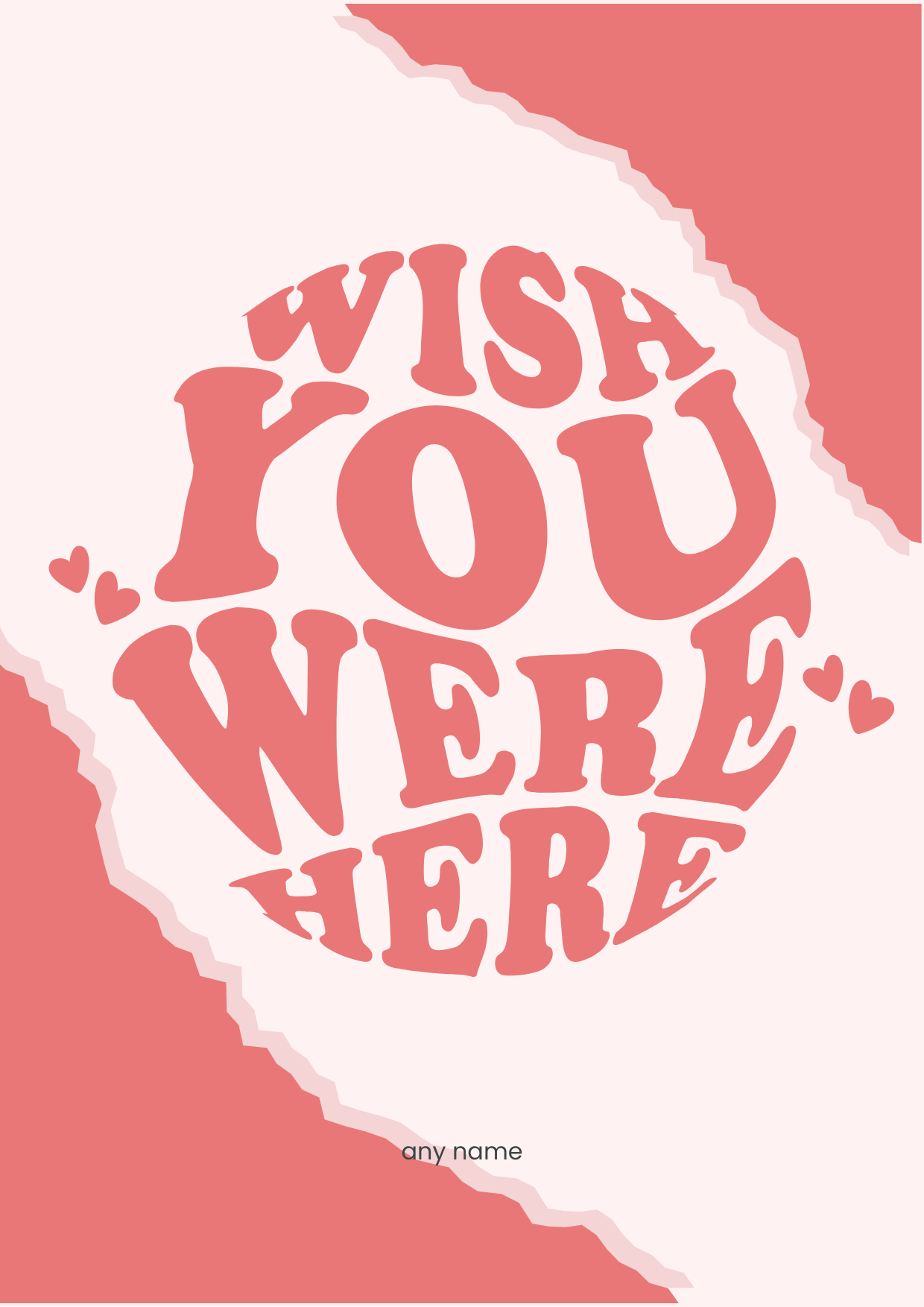 This vibrant card features a striking hand drawn text design that reads Wish You Were Here against a warm pink background. With playful hearts and a nostalgic feel, it clearly expresses longing for someone who is far away. A perfect way to let a loved one know they are missed deeply and that their presence is truly cherished.