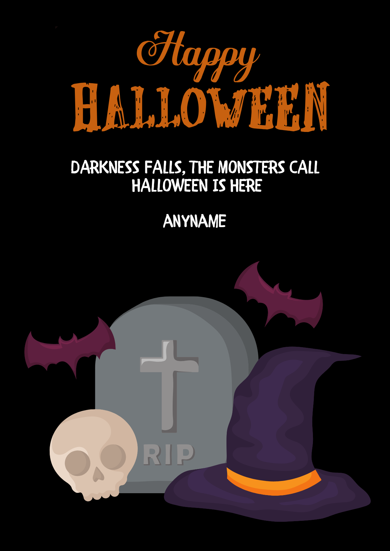 This moody card blends a rich black background with iconic Halloween imagery including a witch hat, bats, and a gravestone.
